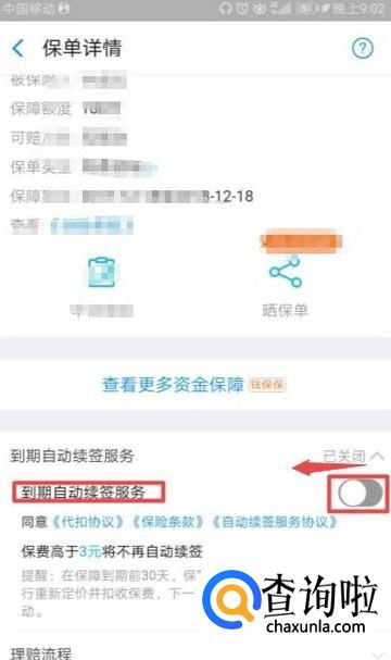 弹出的界面,我们就可以看到到期自动续签服务了,我们将其开关向左滑动关闭就可以了。这样我们就关闭了支付宝账户保险的自动续费功能了。