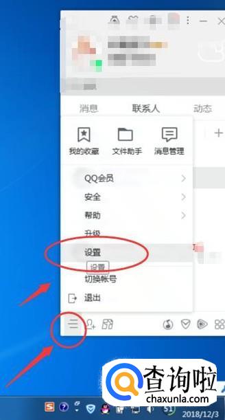打开QQ主界面,然后下方的图标,在弹出的上拉菜单中选择【设置】,如下图所示: