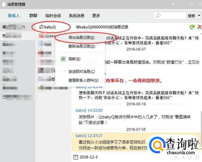 然后选择一个好友之后,右击它,在选择【导出消息记录】就可以了, 如下图所示: