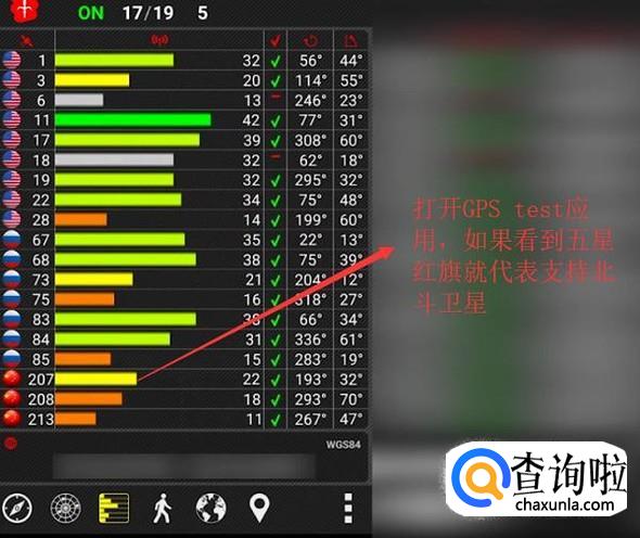 最后我们打开手机中的GPS test应用,如果能看到五星红旗的标志则代表手机支持北斗卫星导航,如下图所示