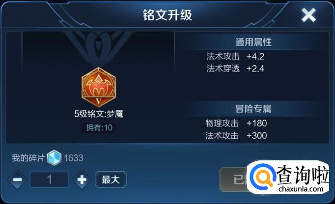 铭文“梦魇”,效果是增加法术攻击和法术穿透,既能增加貂蝉的法术攻击又能增加她的穿透,能让貂蝉的伤害最大化,所以红色铭文应该带10个梦魇