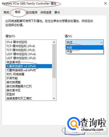 点击"高级→属性→大量传送减负v2(IPv4)→值"文本框向下箭头,选择"关闭"项。读者有什么更好的解决方法,可以在下方留言。