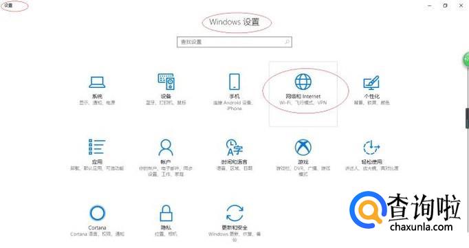 唤出"Windows 设置"程序窗口,我们看到列出了所有设置项目。点击"网络和Internet"图标,用户可以根据自己的喜好和需要对系统进行设置。