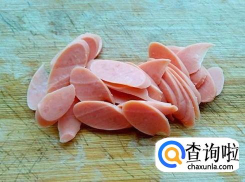 火腿切成斜片,这样炒的时候很容易入味。