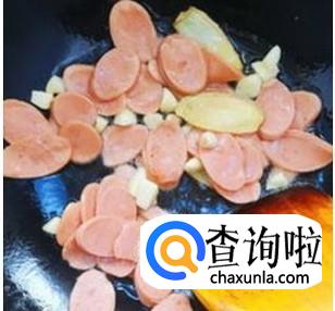锅里倒油烧热,放入葱姜蒜爆香,然后直接把火腿放进去翻炒几下。