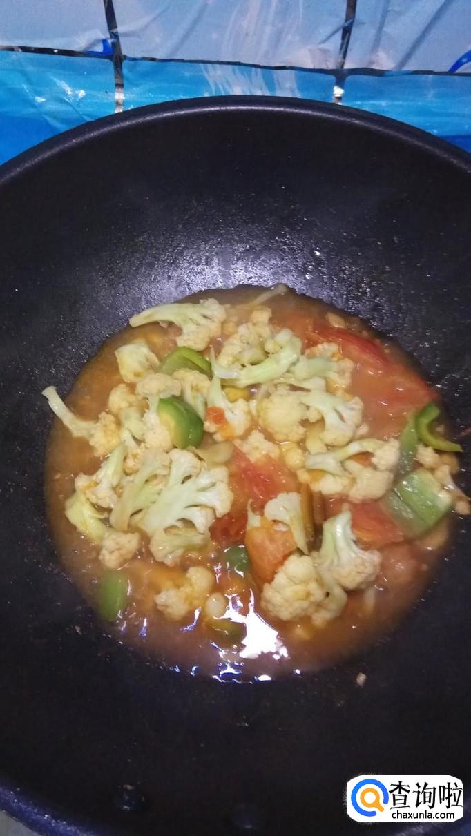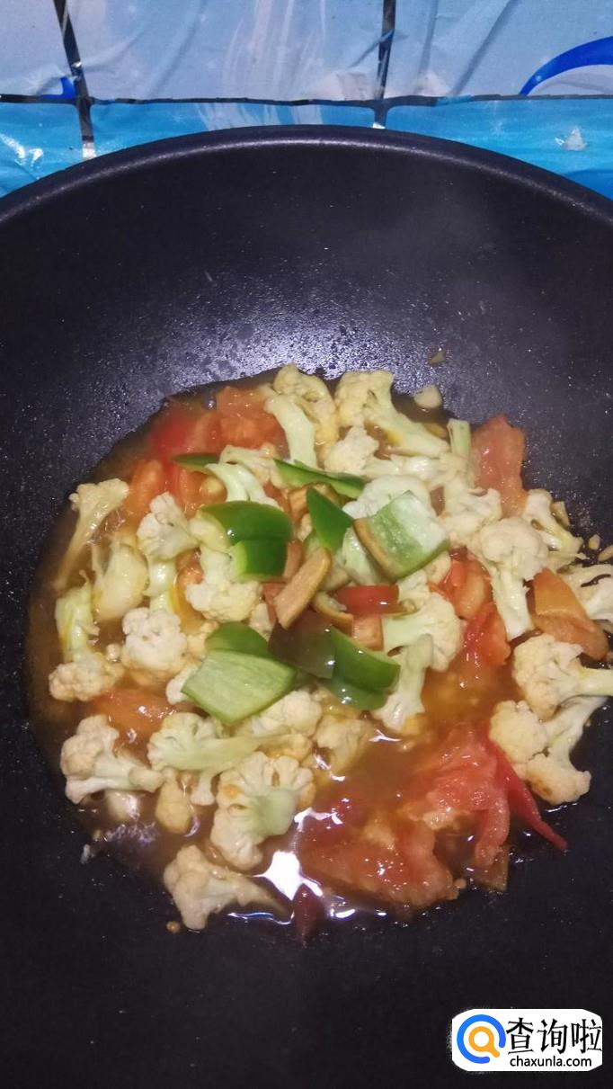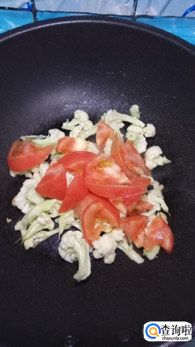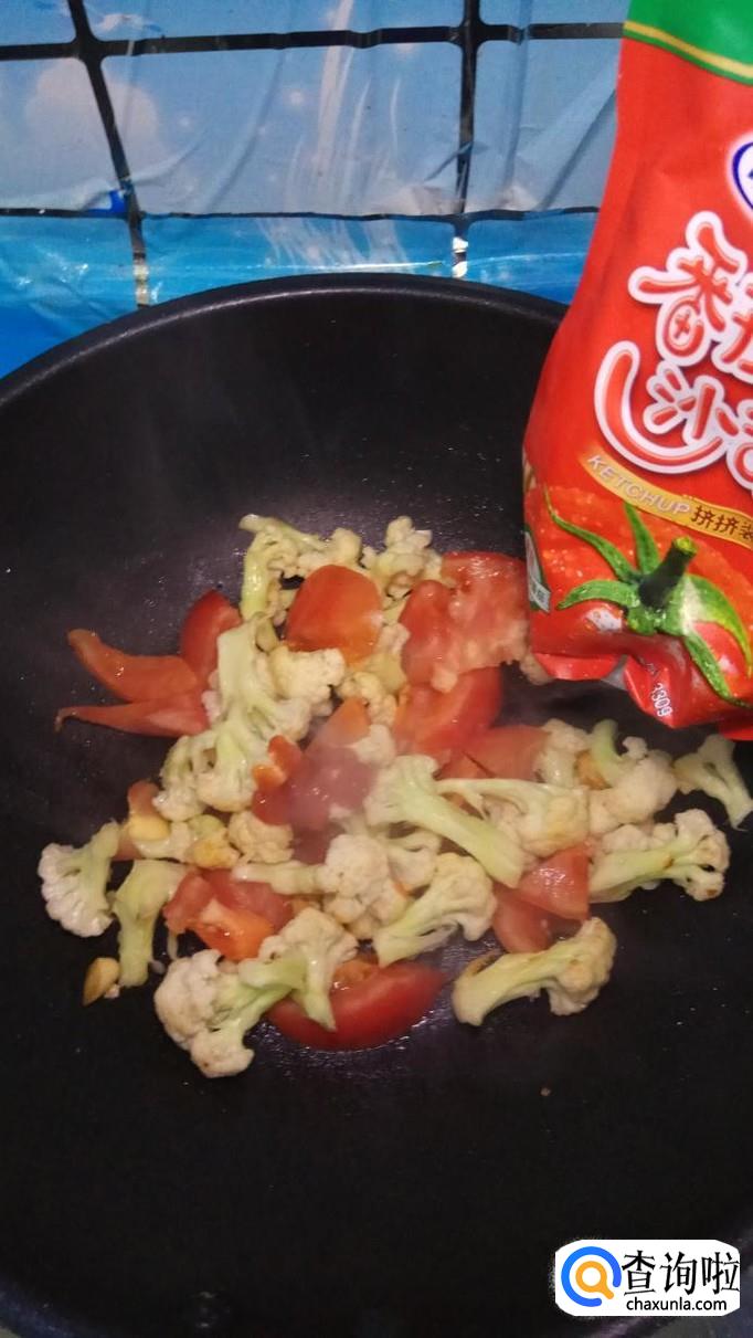 将西红柿倒入锅中,和花菜一起翻炒,炒至西红柿变软出汁就差不多了。再加入适量番茄酱,这样色泽会更加好看。