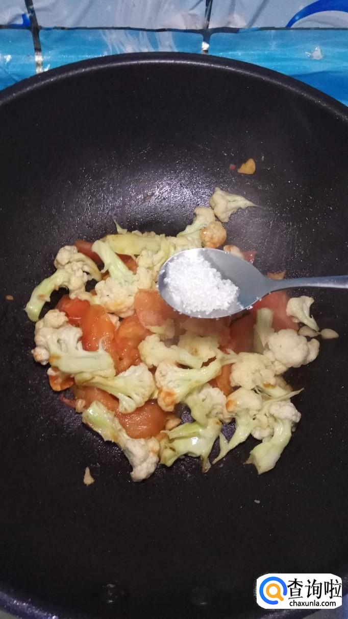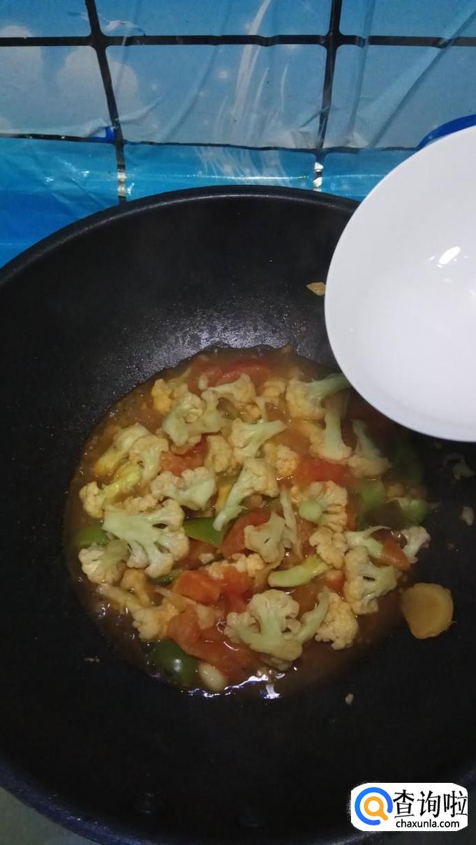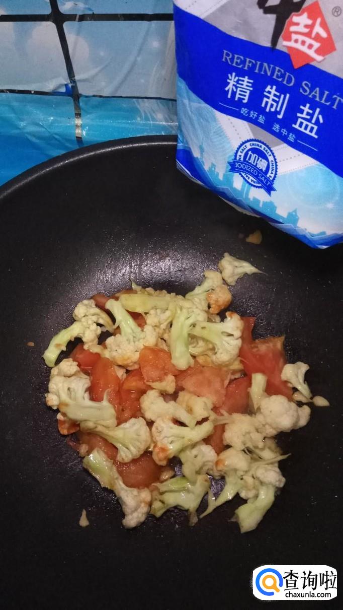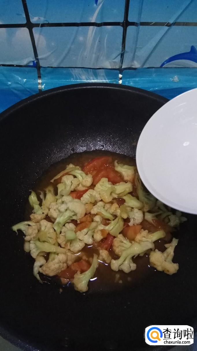 将西红柿倒入锅中,和花菜一起翻炒,炒至西红柿变软出汁就差不多了。再加入适量番茄酱,这样色泽会更加好看。
