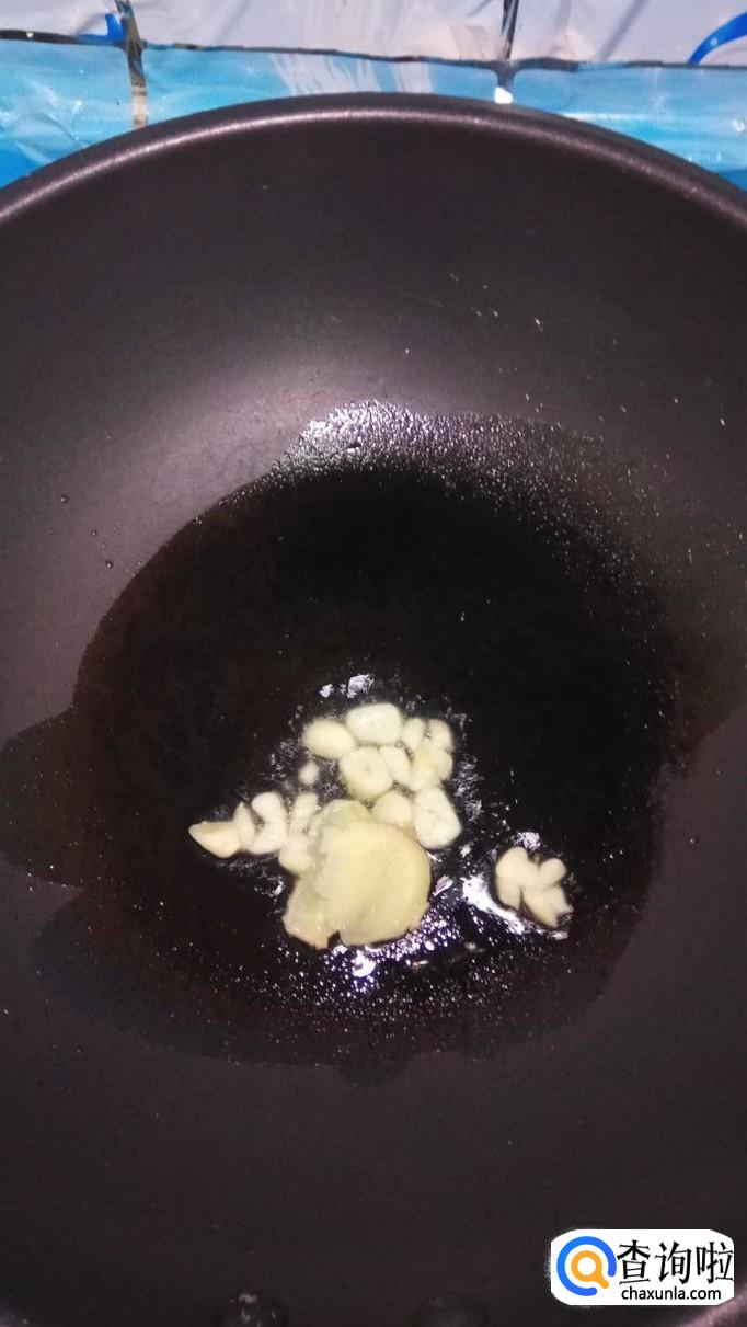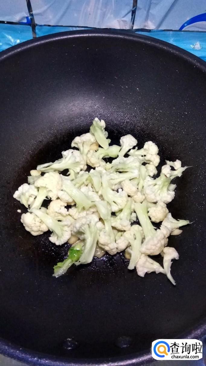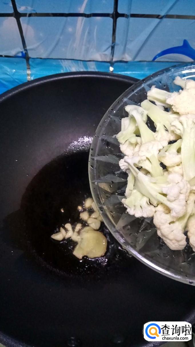 炒锅中放入适量油,油热后放入蒜片爆香,然后将花菜放入锅中翻炒两分钟。