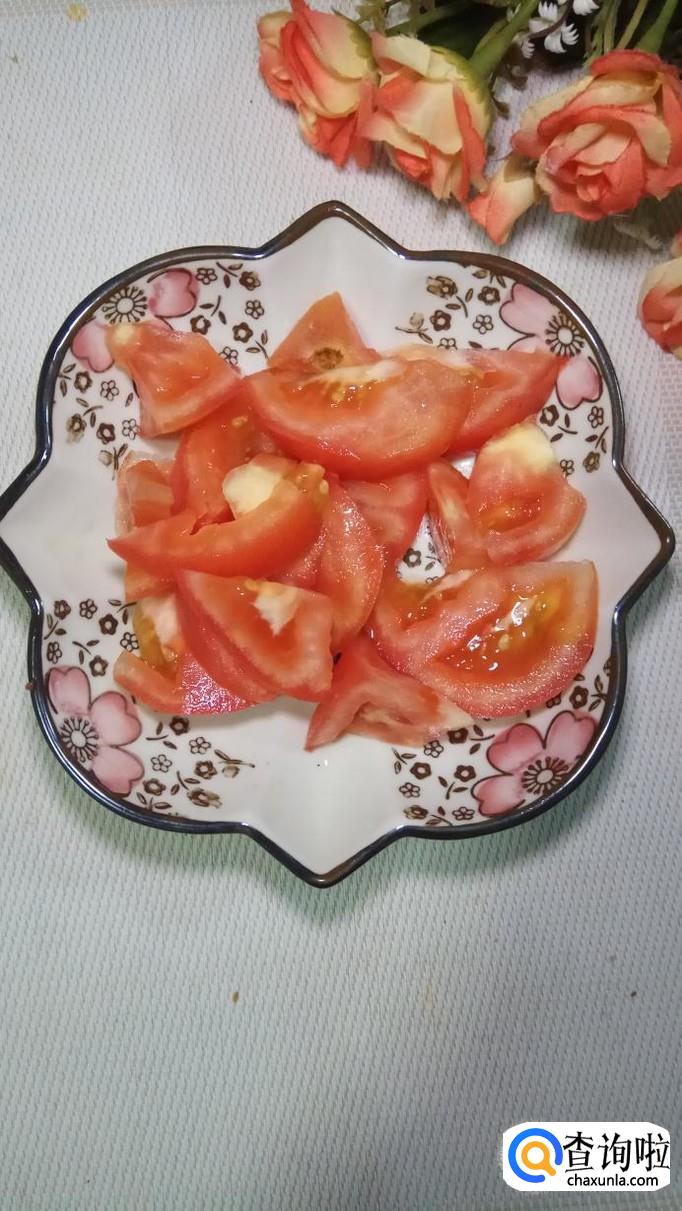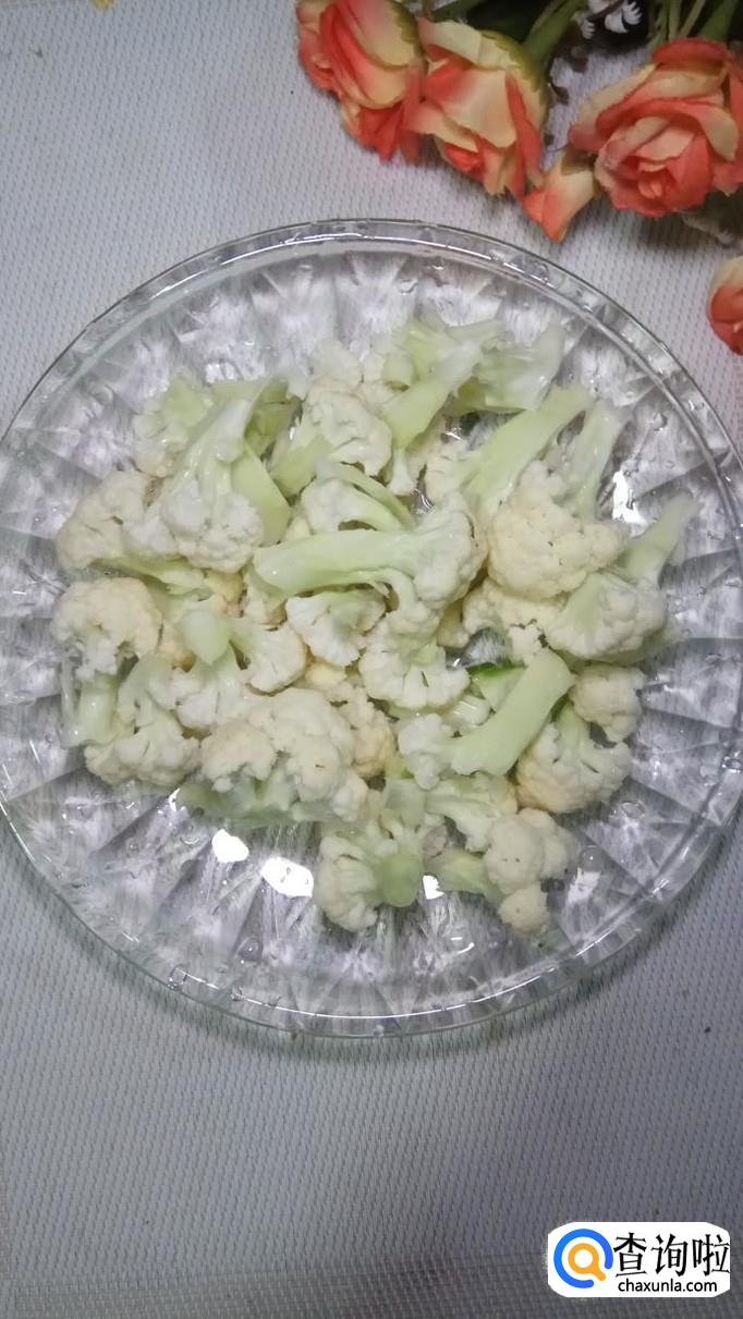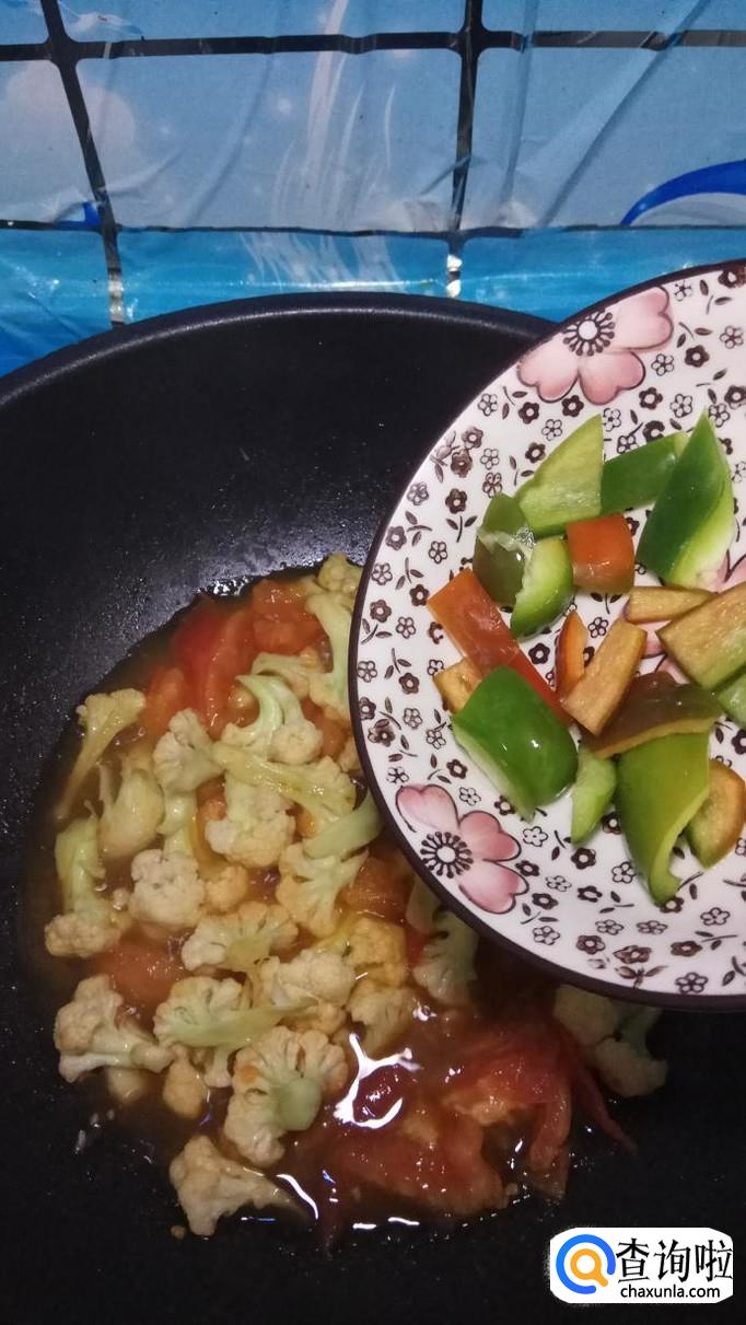 将花菜撕开,撕成小朵,放入盘中备用,将西红柿切块儿,青椒切成小块儿,放入盘中备用。