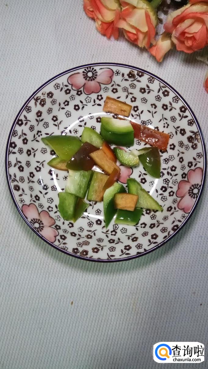 加入少许清水,然后将青红椒块倒入锅中,搅拌均匀,盖上锅盖儿,焖两分钟左右。