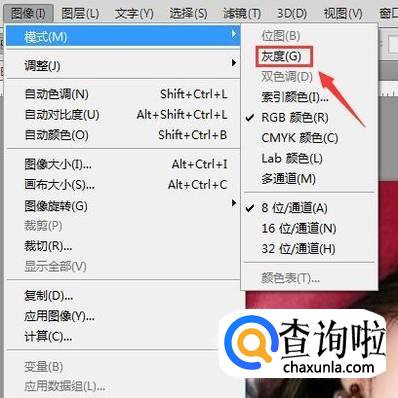 使用ps将我们的图片打开,然后在图像里找到模式选项,点击该选项在其子级菜单哪里找到灰度选项,如图所示:
