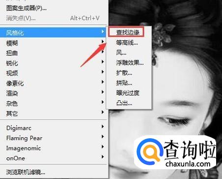 点击灰度选项在弹出的对话框里选择扔掉,然后再在滤镜菜单里找到风格化选项,点击该选项在其子级菜单哪里找到查找边缘选项,如图所示: