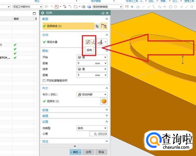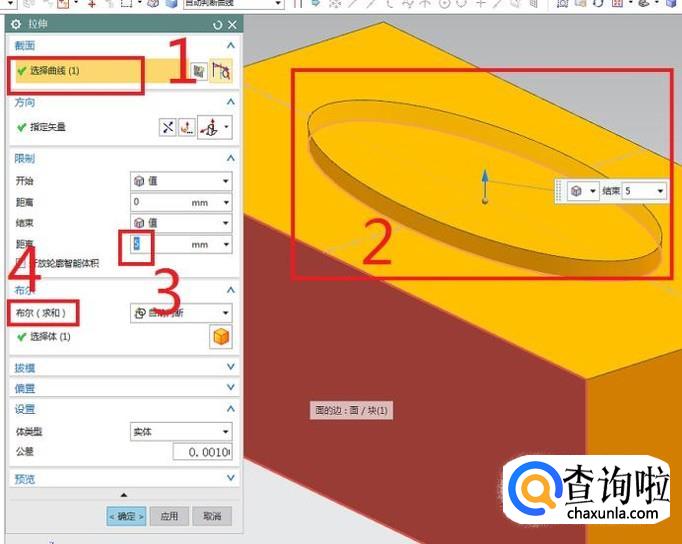 退出草图之后,点击拉伸命令,拉伸截面旋转刚刚画的椭圆。然后你们可以看到如下图所示的4个红色框选。
