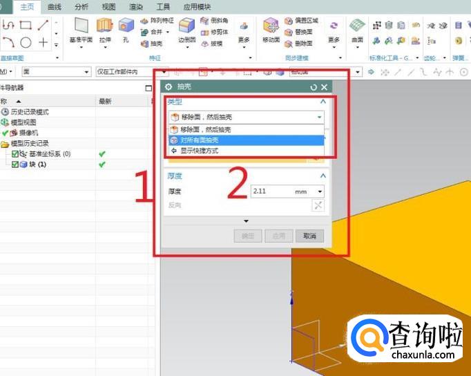 如下图所示,弹出“抽壳”对话框(见1号红色框选)。注意2号红色框选,我们可以看到默认的抽壳类型是:移除面,然后抽壳。然而我们这里要用到的是另外一种抽壳类型:对所有面抽壳。所以这一步的操作就是修改抽壳类型为对所有面进行抽壳。