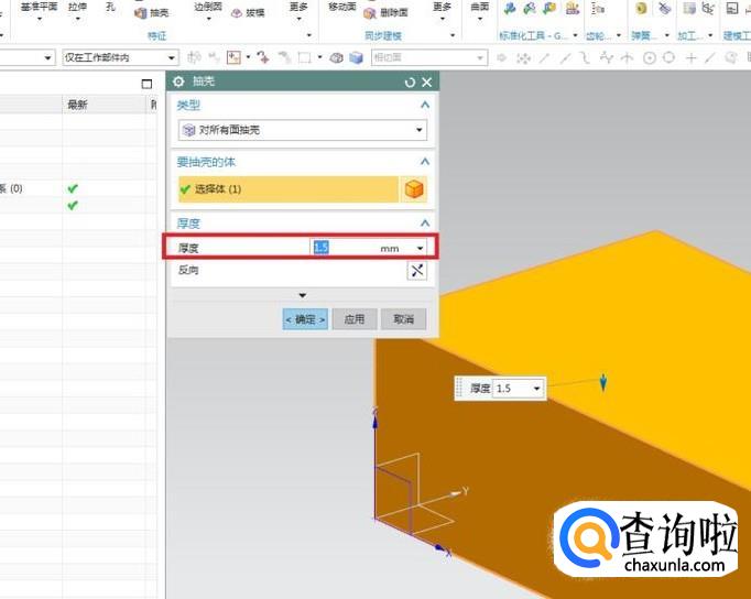 选择完需要抽壳的长方体,然后看默认的厚度是否合适,笔者觉得不太合适,就给改成了1.5。(不管合不合适,这里都会修改一下,方便你们认识)