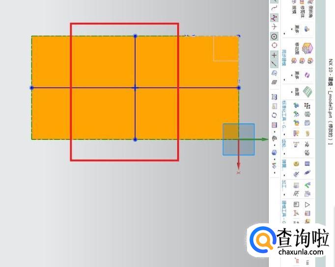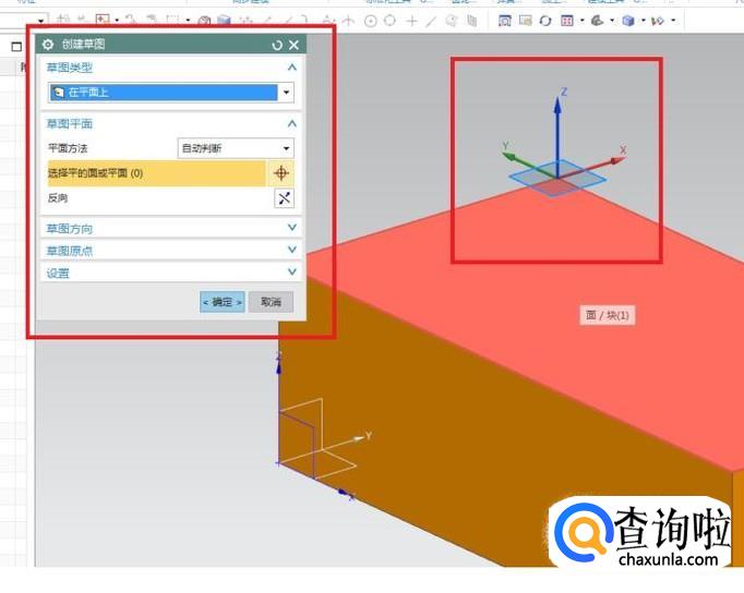 如下图所示,先创建一个草图,草图表面选择长方体的上表面(也就是下图中变成红色的表面。)