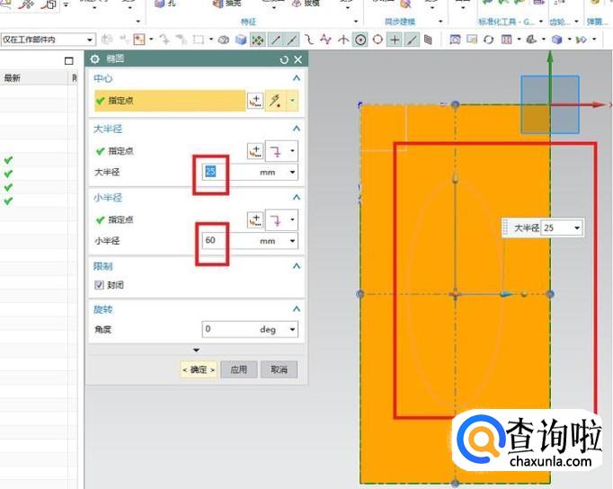 选完椭圆的中点之后,矩形上回出现椭圆的预览效果(虽然因为颜色的缘故不是太清晰),我们可以根据预览效果来设置椭圆的大、小半径。如下图所示,设置好尺寸参数之后,完成椭圆的绘制,并退出草图。