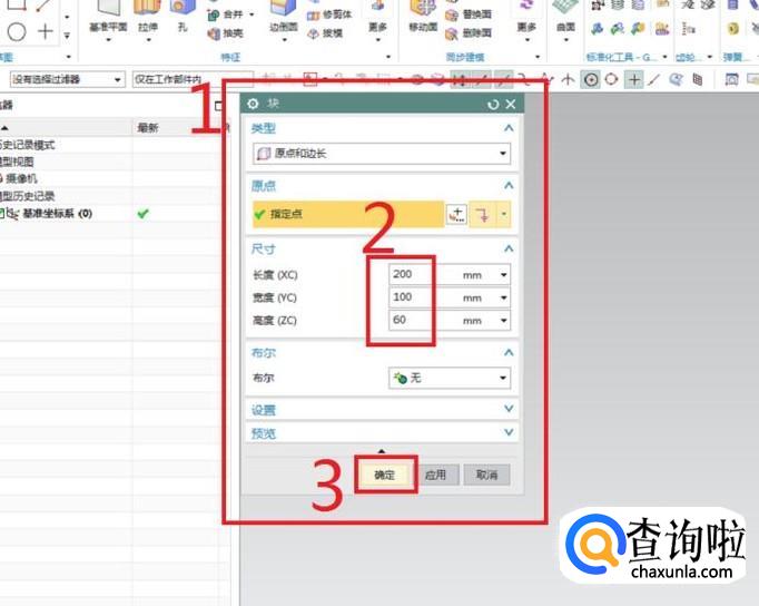 执行【菜单】【插入】【设计特征】【长方体】,激活长方体命令快速插入一个长方体,尺寸200x100x60。详细步骤、尺寸请见下图(第一幅图是具体步骤,第二幅图是具体尺寸)