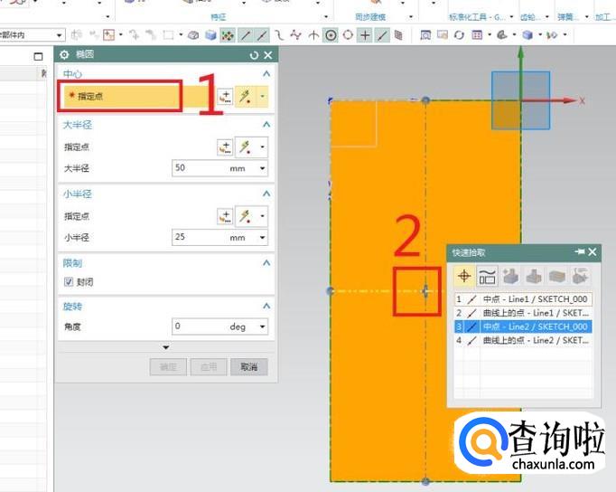 激活“椭圆”命令之后,会弹出如下图所示的“椭圆”对话框,我们先要指定它的中心点,就是刚刚两条直线的中点(操作到这一步,笔者才发现,似乎一条直线就够了)。