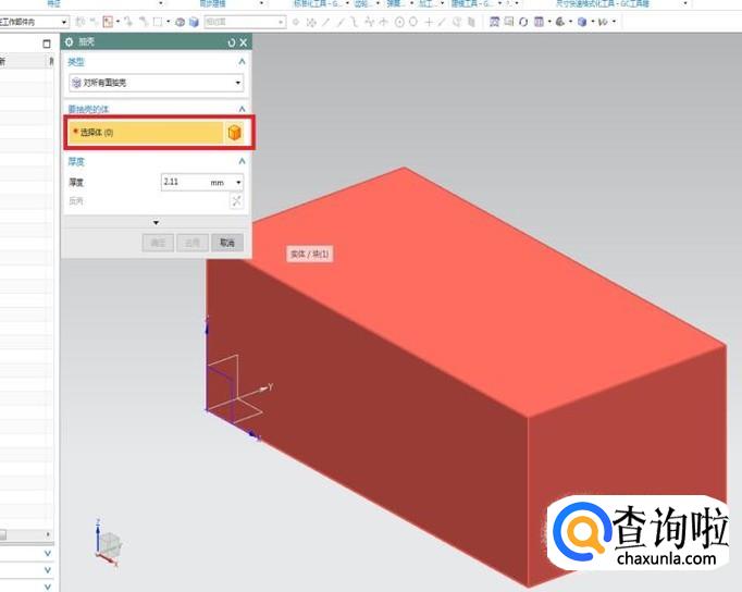 如下图所示,抽壳类型修改完毕,接下来要做的是选择要抽壳的实体,也就是刚刚插入的长方体(见下图,变成红色的长方体)。