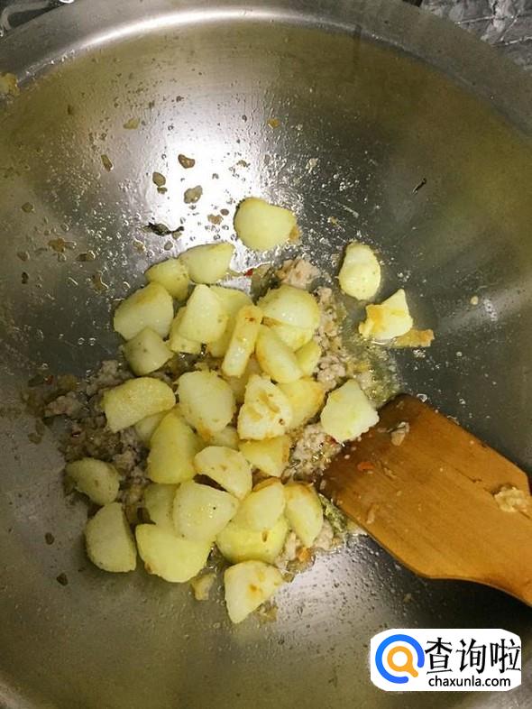 放入锅中,加入适量水,水面稍微炒出土豆即可,大火煮开后转小火5分钟左右,当筷子能轻松地插入土豆中,就可以了。