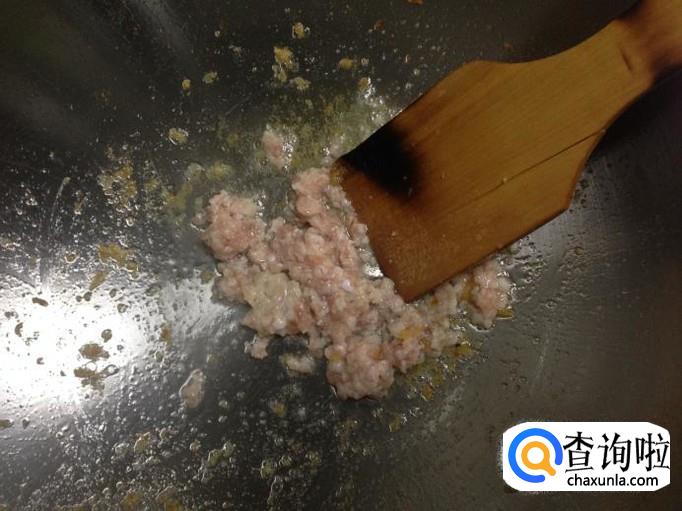 油锅继续加热,把肉末倒入锅中,大火翻炒。