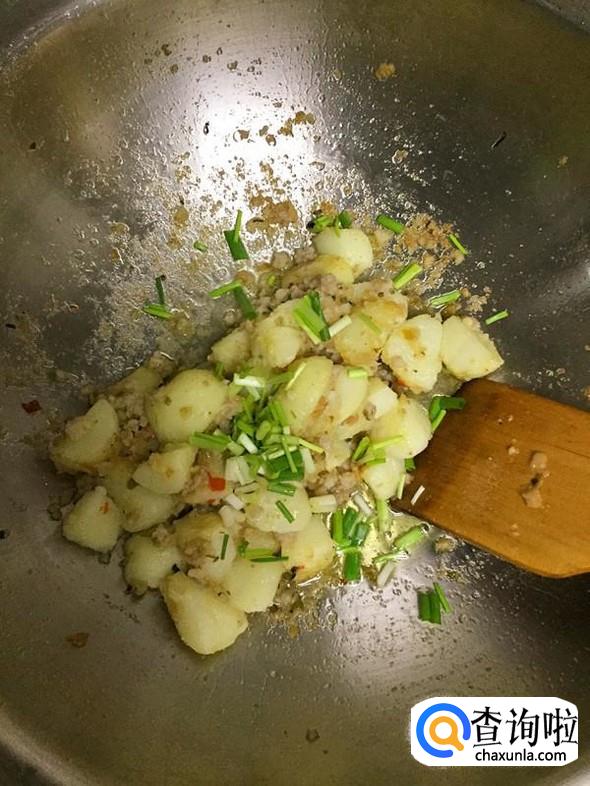 炒匀后把土豆也到入锅中,中火翻炒1-2分钟。