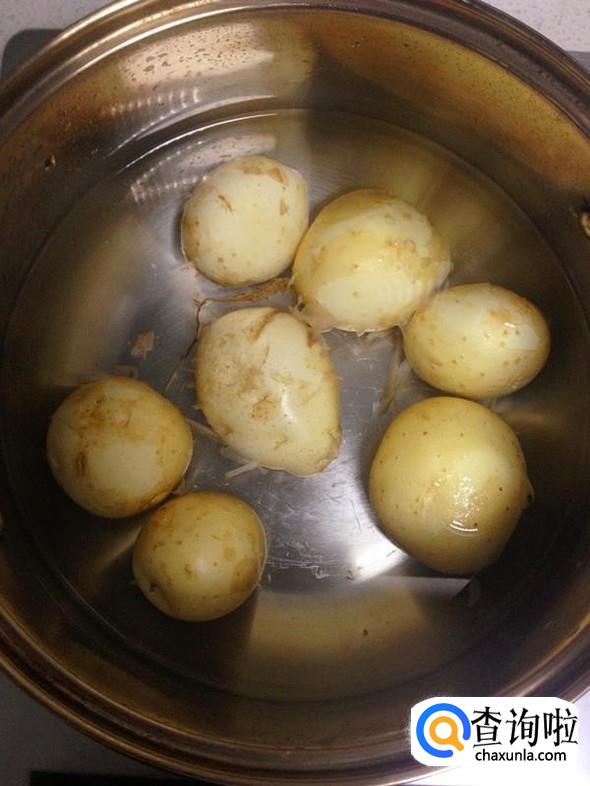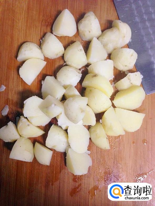 把煮好的土豆捞出,晾凉后剥去土豆片(煮熟的土豆很容易去皮),然后切成小块。