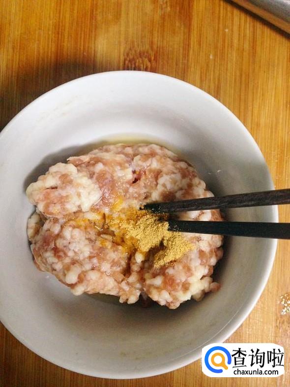 肉末放入碗中,依次加入1小勺料酒和生姜粉,搅拌均匀。