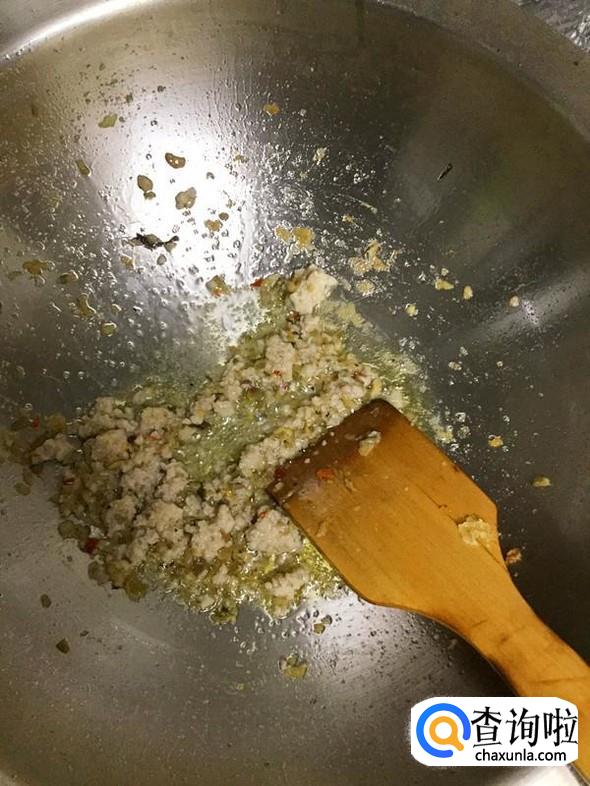 炒至肉末变色,加入酸菜一起翻炒。