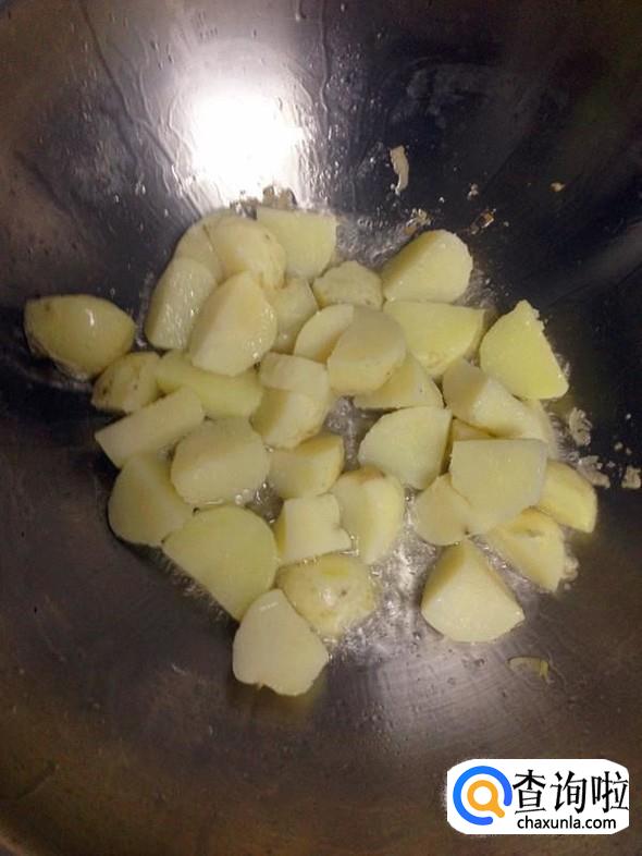 油锅烧热,把切成小块的土豆放入锅中,中火煎制。