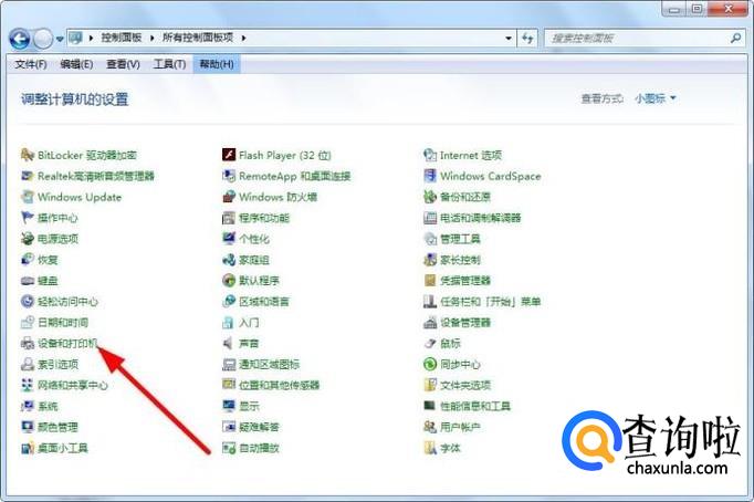 在控制面板找到“设备和打印机”栏目点击进入。如图