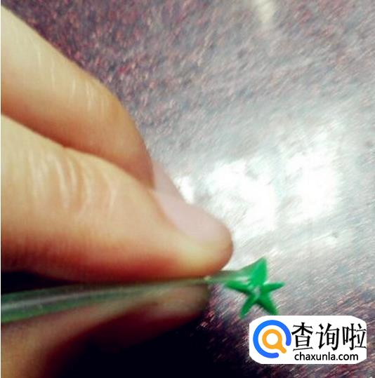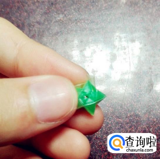 这个绿色的星星形状已经非常明显了。折到后面将尾巴塞进一个脚中,把多出来的一段剪掉,就做好啦。