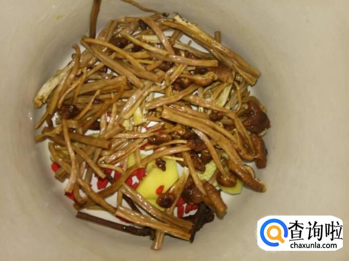 取一把茶树菇,将茶树菇的根部一个个剪掉一小段距离,再加点水泡软;