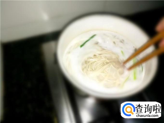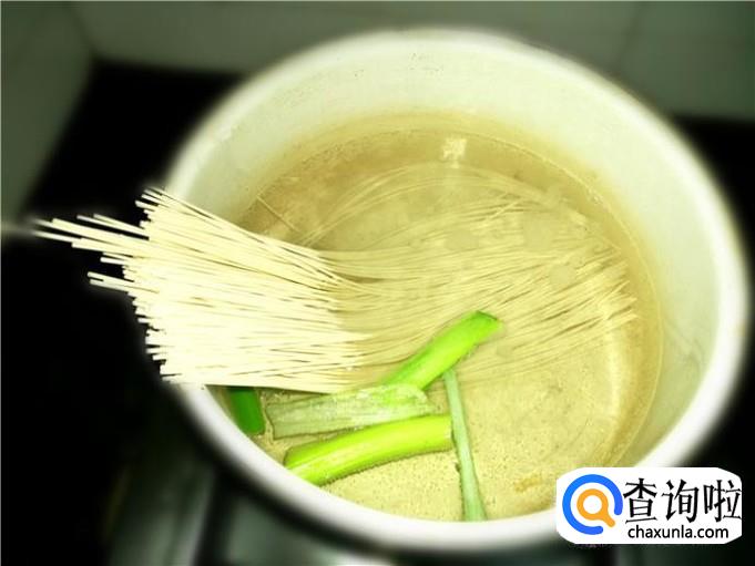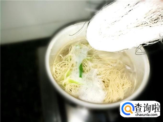 气泡出现很多了,就可以下挂面了,挂面数量为一捆挂面的四分之一(约为80根),挂面入水部分软了之后,马上用筷子把未浸水的部分怼到锅里。