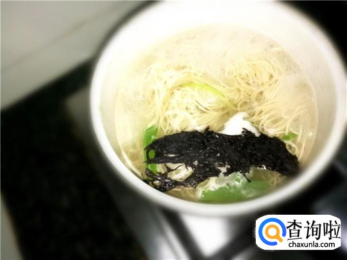 待粉丝沉入锅里之后,放入整个手掌一半大小的紫菜。