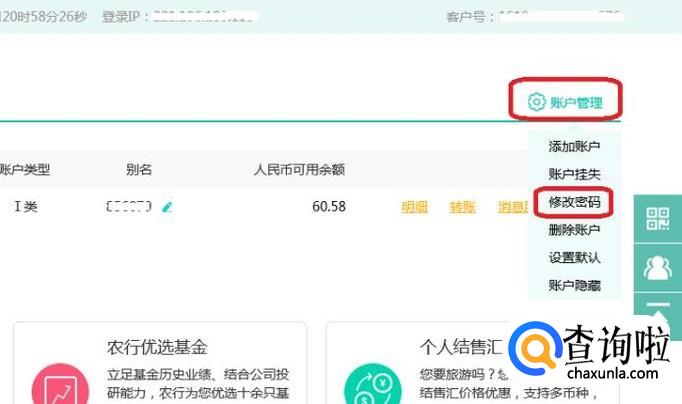 此时,就进入了银行卡的详情页,如图所示,右上角有一个“账户管理”,我们把光标移到它上面,会弹出菜单,我们点击“修改密码”。