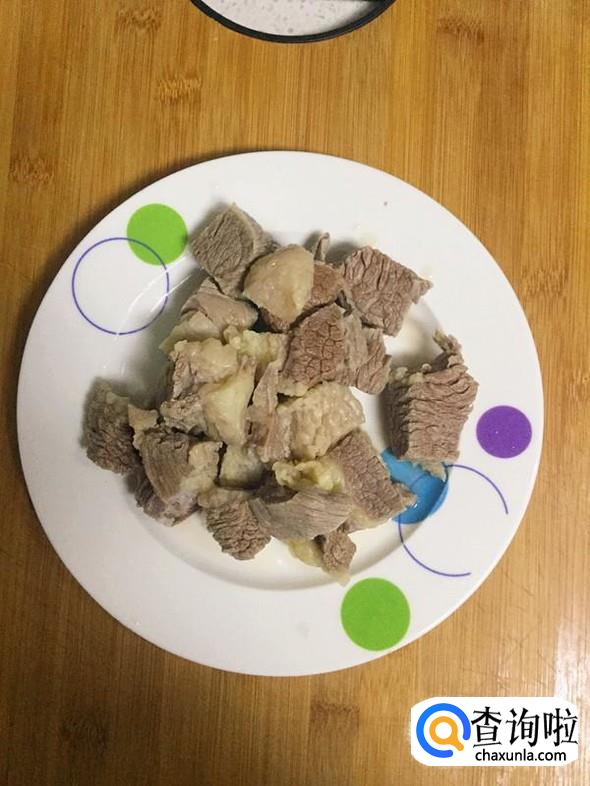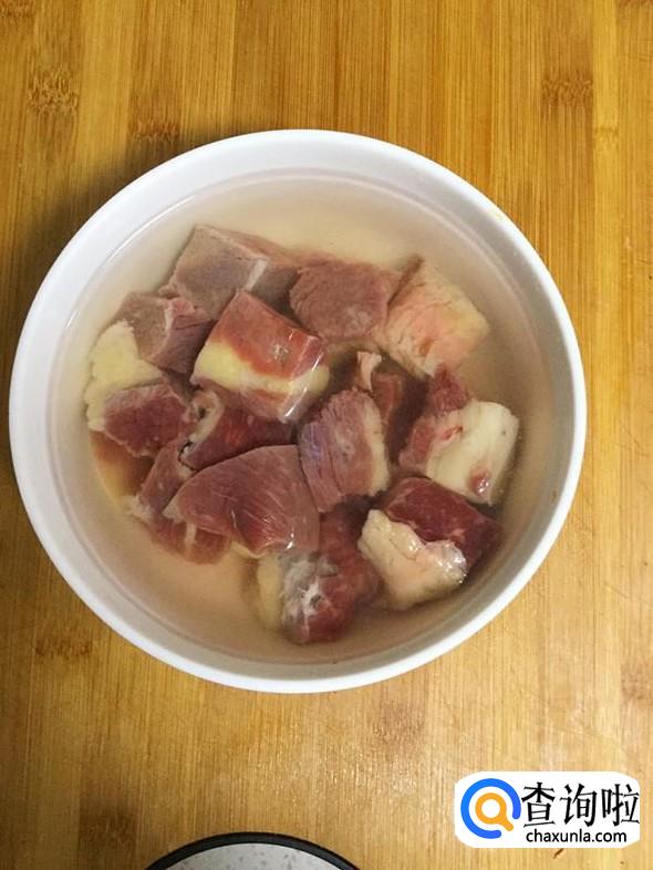 然后再切成小块放入有一定深度的大碗中,加入清水浸泡,使牛肉浸泡出其中的血水,并清洗干净。