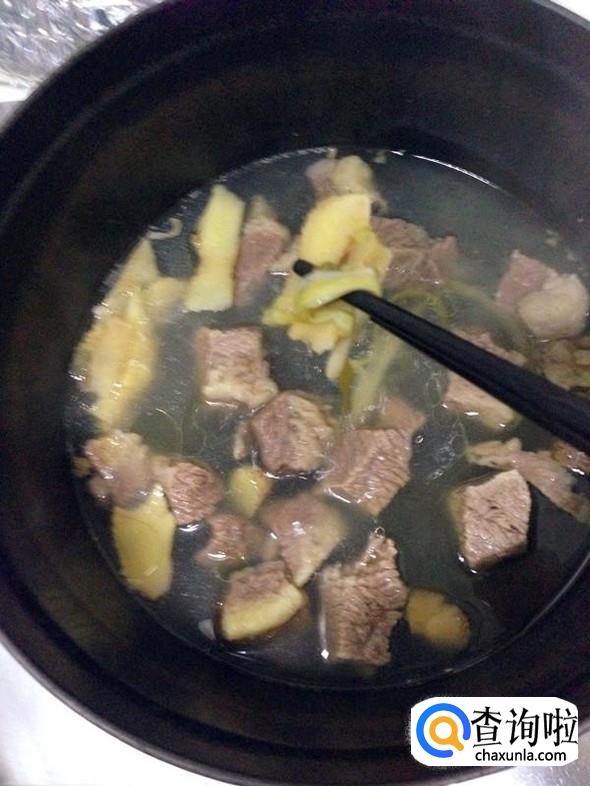 牛肉炖至软烂时,挑出其中的生姜皮和香葱以及茴香,丢弃不用。
