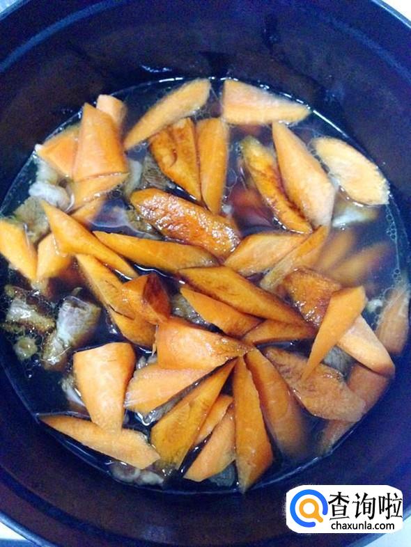 加入切成滚刀块的胡萝卜,再依次加入1小勺生抽、红烧酱油和白糖。