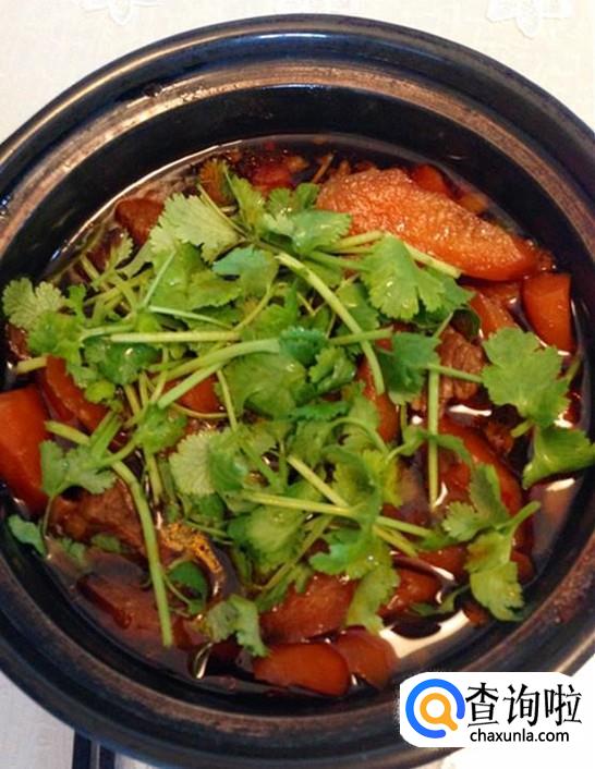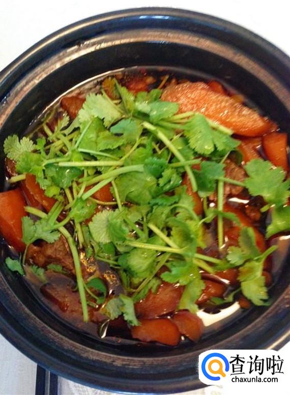 大火煮开后转小火,炖至胡萝卜变软后,撒上少许香菜,就可以上桌了。