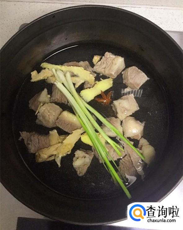 牛肉块放入珐琅锅中,依次加入1小勺料酒、适量生姜皮和1粒茴香,再放入少许香葱和适量水,使水面基本与牛肉持平,大火烧开后转小火40分钟左右。