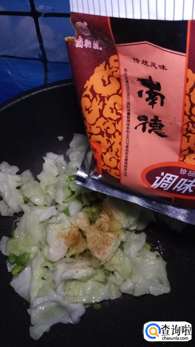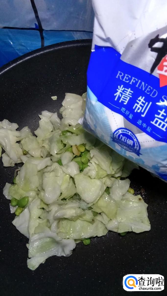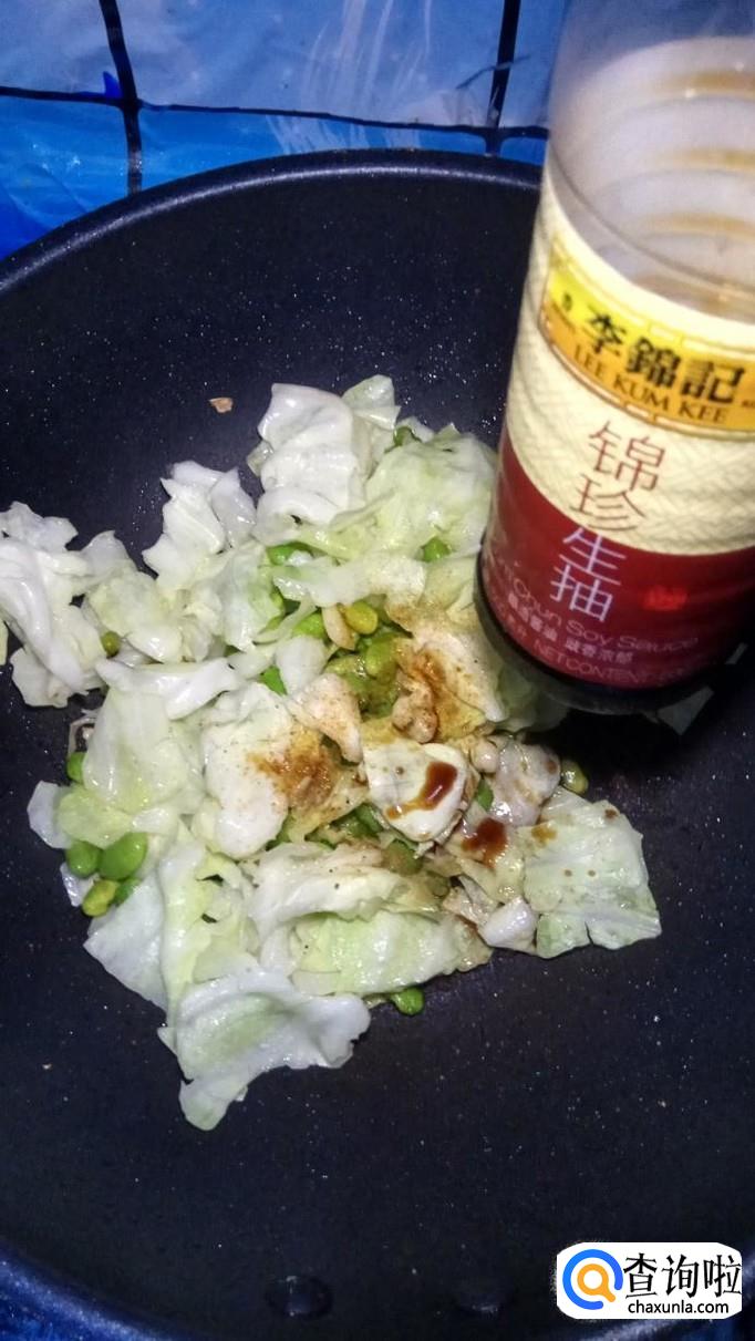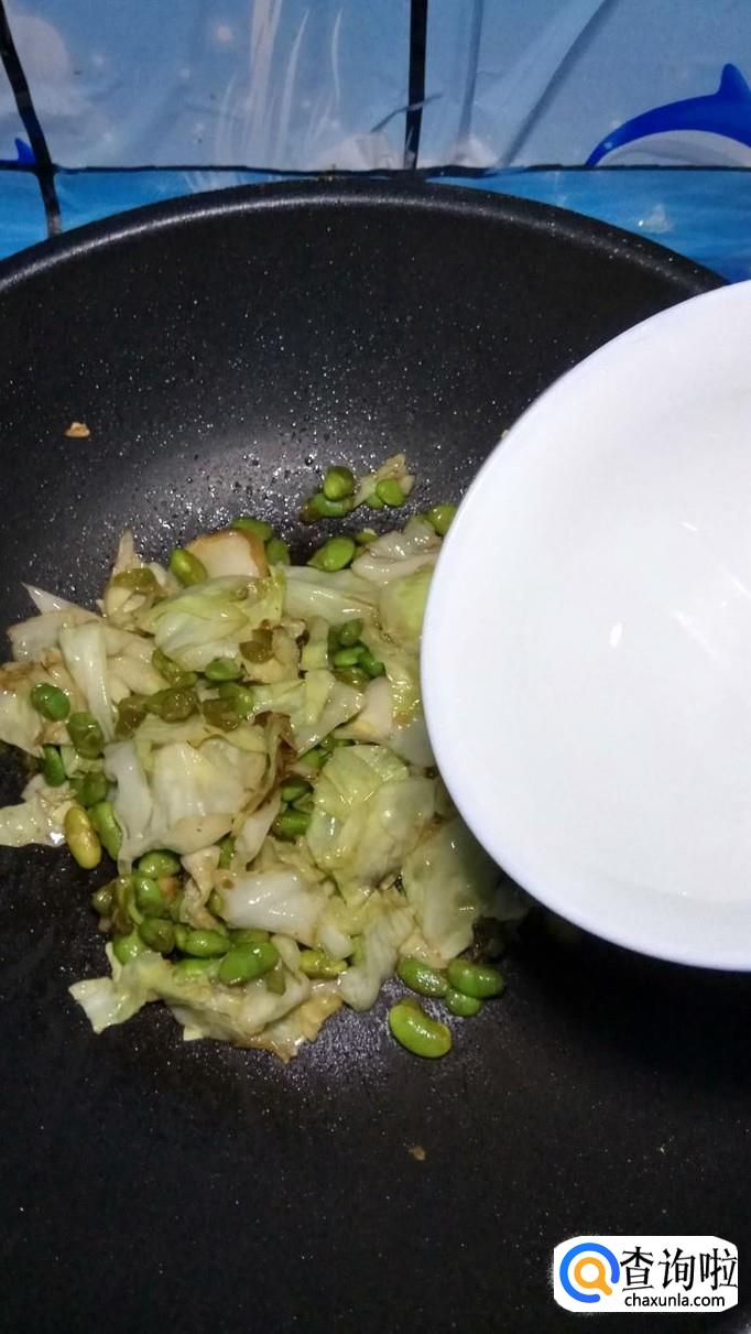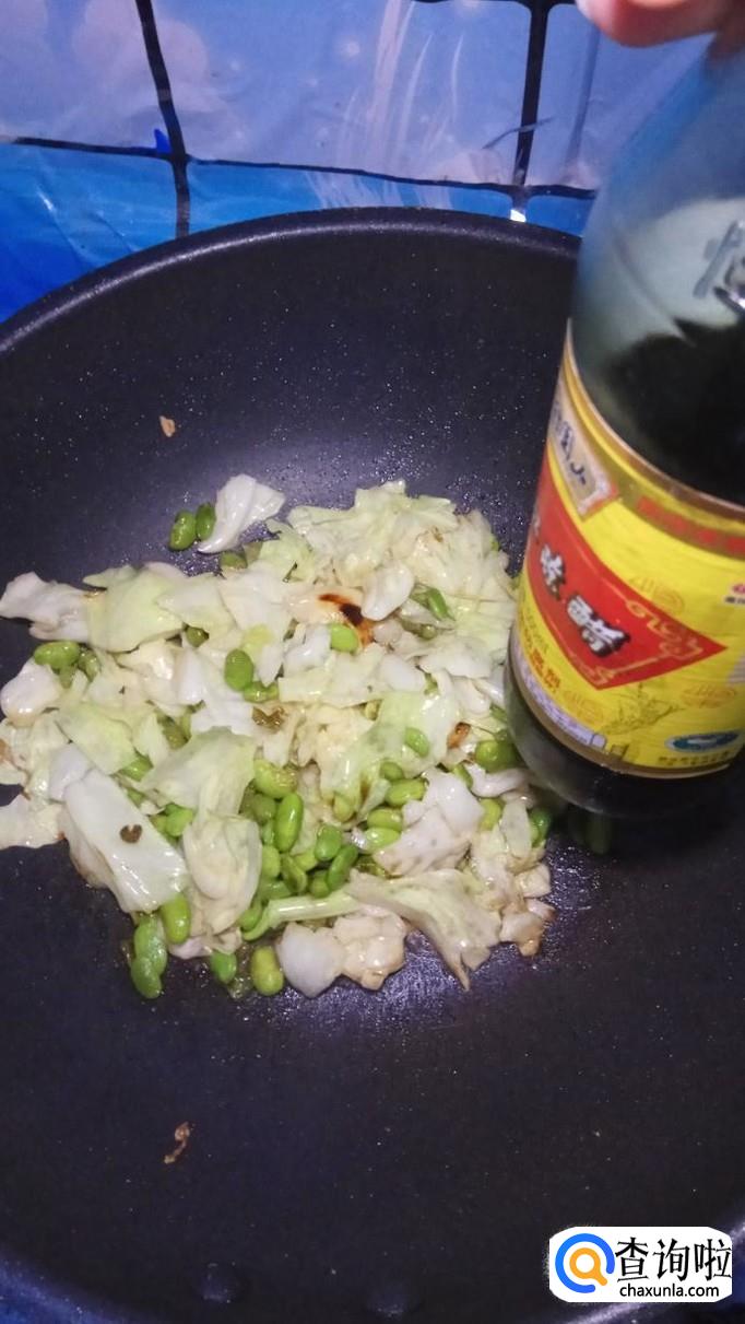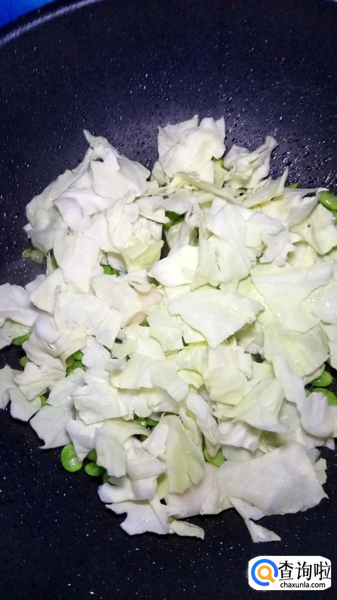 将洗好的包菜,放入锅中,和毛豆一起翻炒。