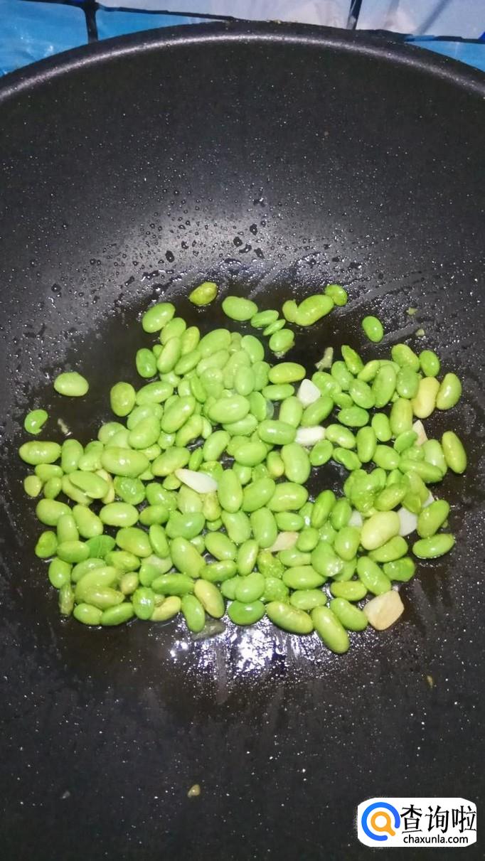 将毛豆放入锅中,炒一下,炒至表面微微起皱。