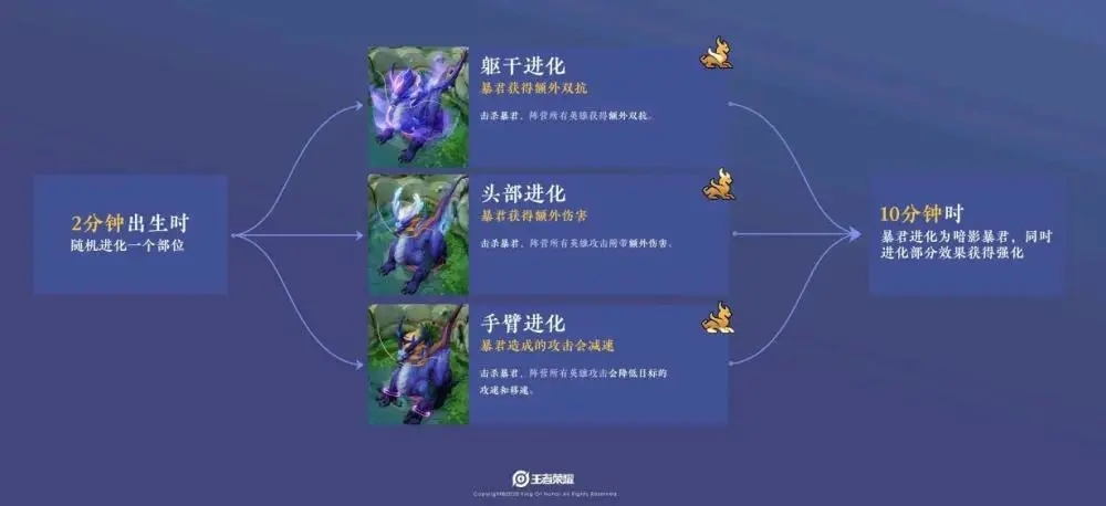 新版本中暴君主宰有了进化的特性,当他们出现的时候,会出现头部,躯干,手臂的随机变化,不同的效果会出现不同的特效。躯干进化会让三路随机一路的先锋获得更高的抗性,变得更加耐打。头部进化会让先锋增加射程和伤害,体验服中先锋获得这项增益可以在塔外点塔,拆塔的速度也更快。最后一个是手臂进化,会让主宰先锋具有让英雄或防御塔降低攻速的效果,同时对英雄还会造成减速。