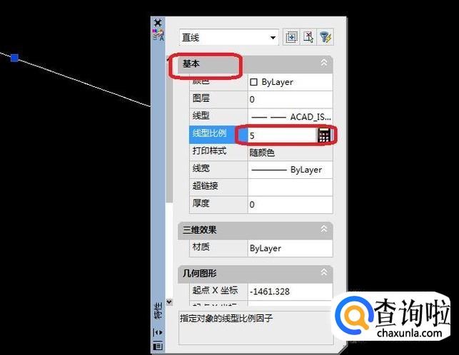 在特性面板中,我们调大线型比例,比如,我调整线型比例为“5”(可以根据需要调整),然后关闭面板,看看效果。