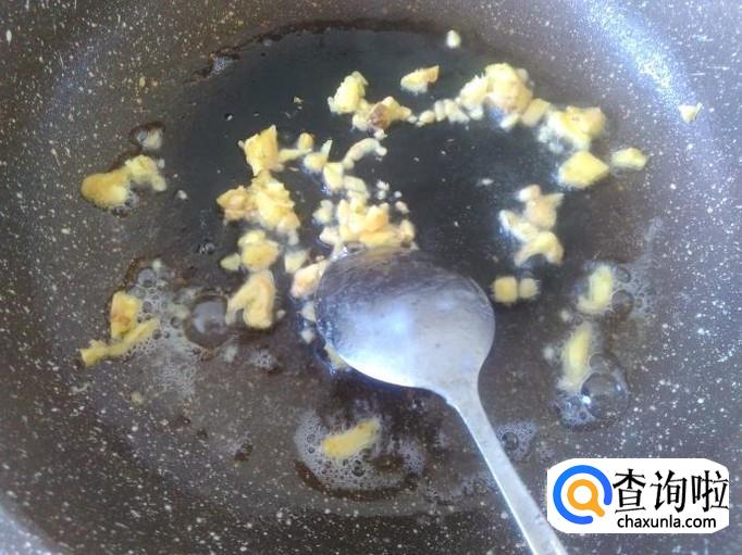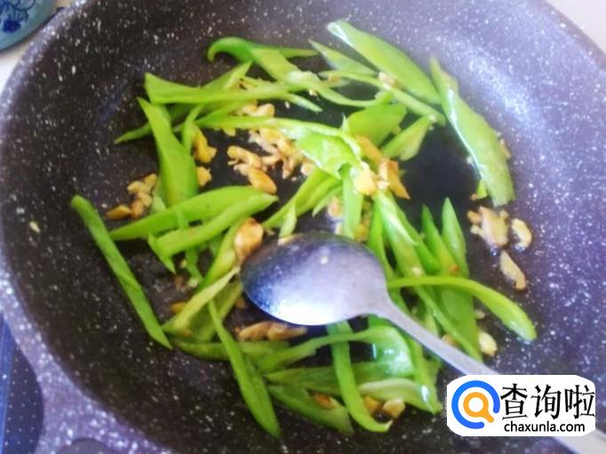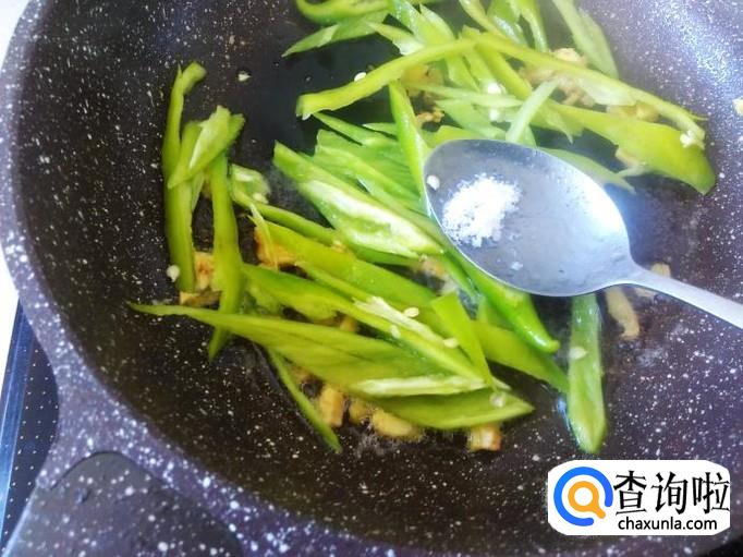 开火下油,放姜蓉进去爆出味来,然后放青椒进去,加适量的盐。