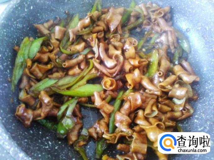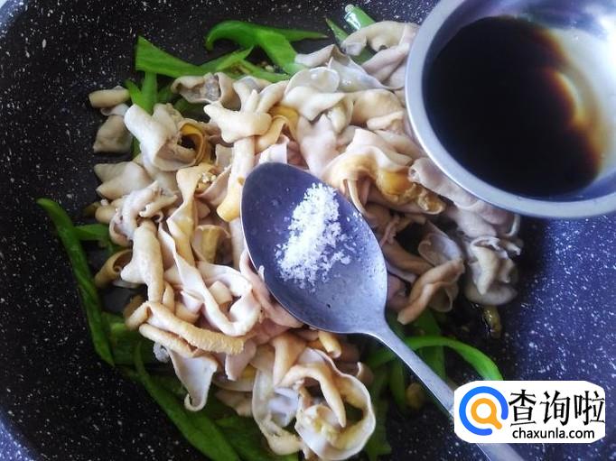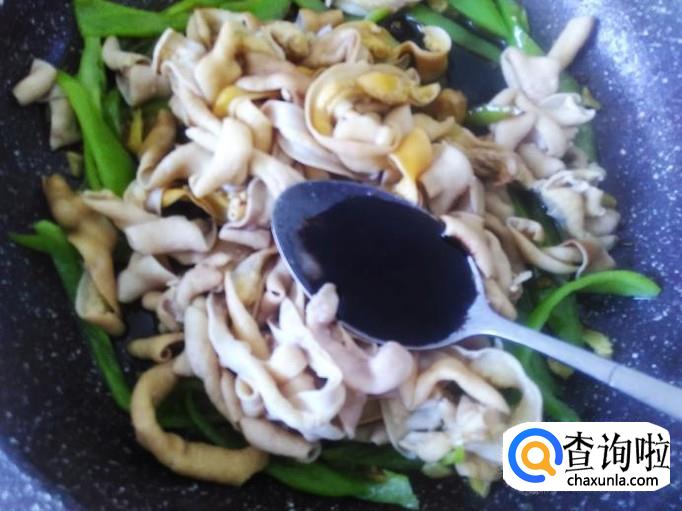 翻炒至青椒变软,放鸡肠进去,加适量的盐、1勺生抽、1勺料酒。