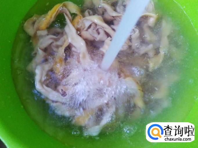 捞上来放到盘子里再用水把油脂冲洗干净,然后抓干水份,用剪刀剪成一段段放到盘子备用。
