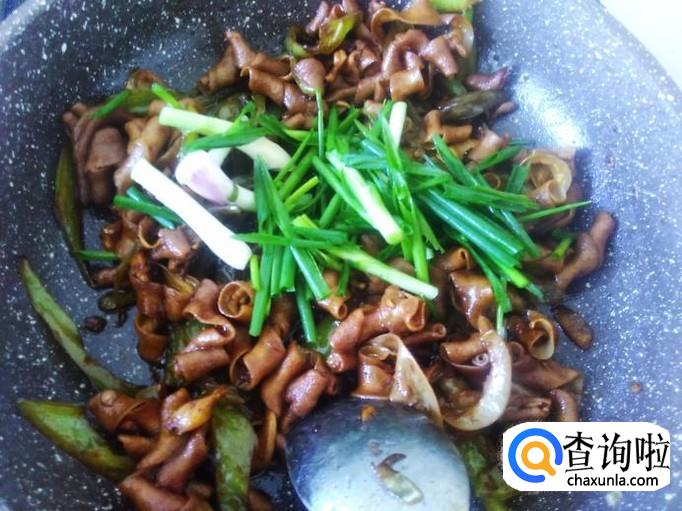 爆炒到鸡肠焦黄色,然后下香葱进去翻炒一下就可以了。